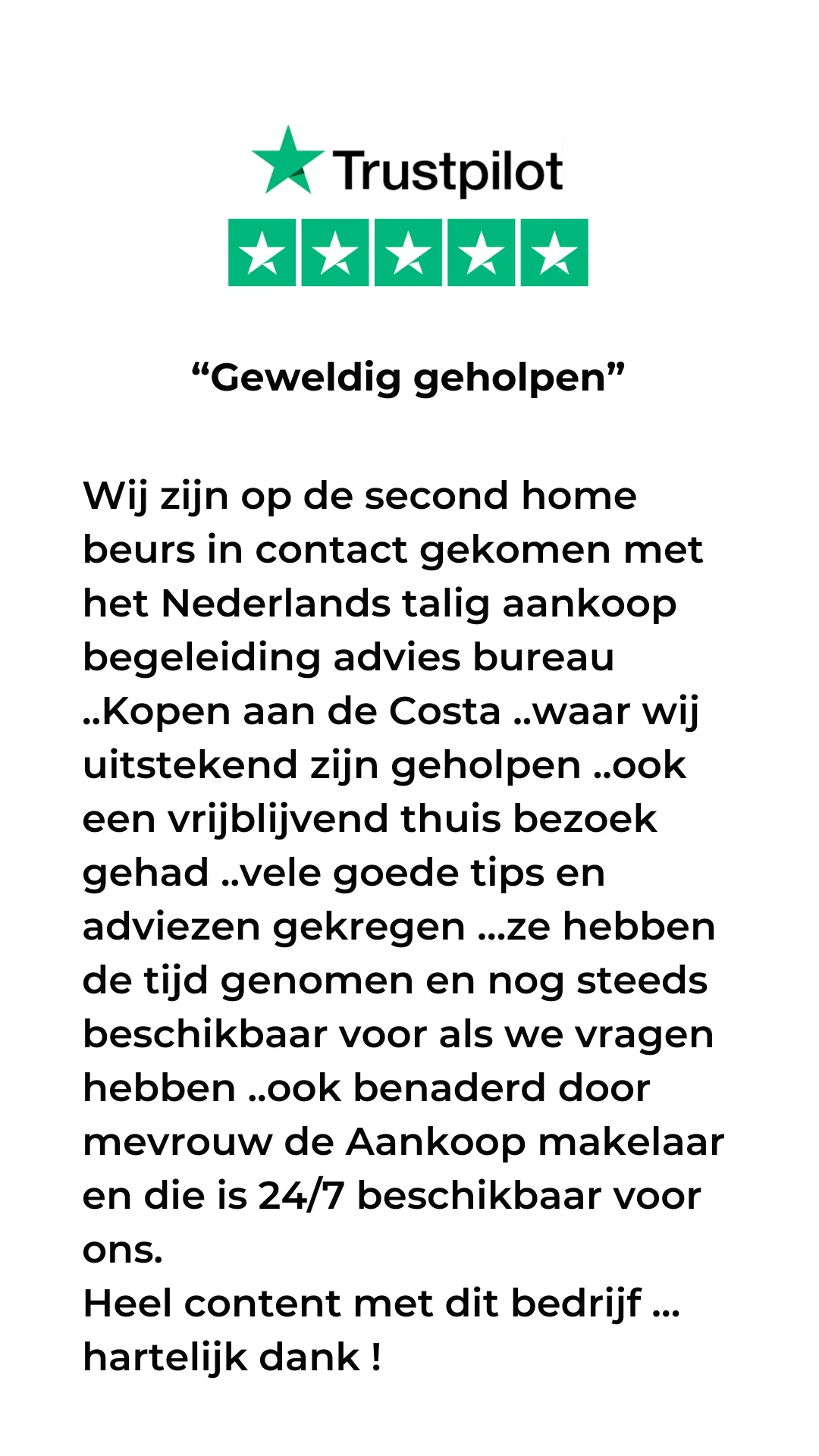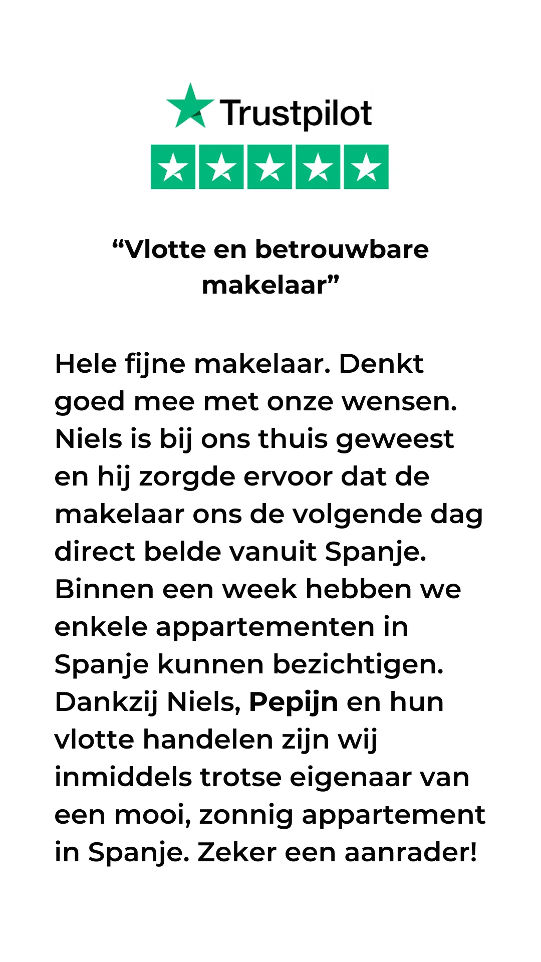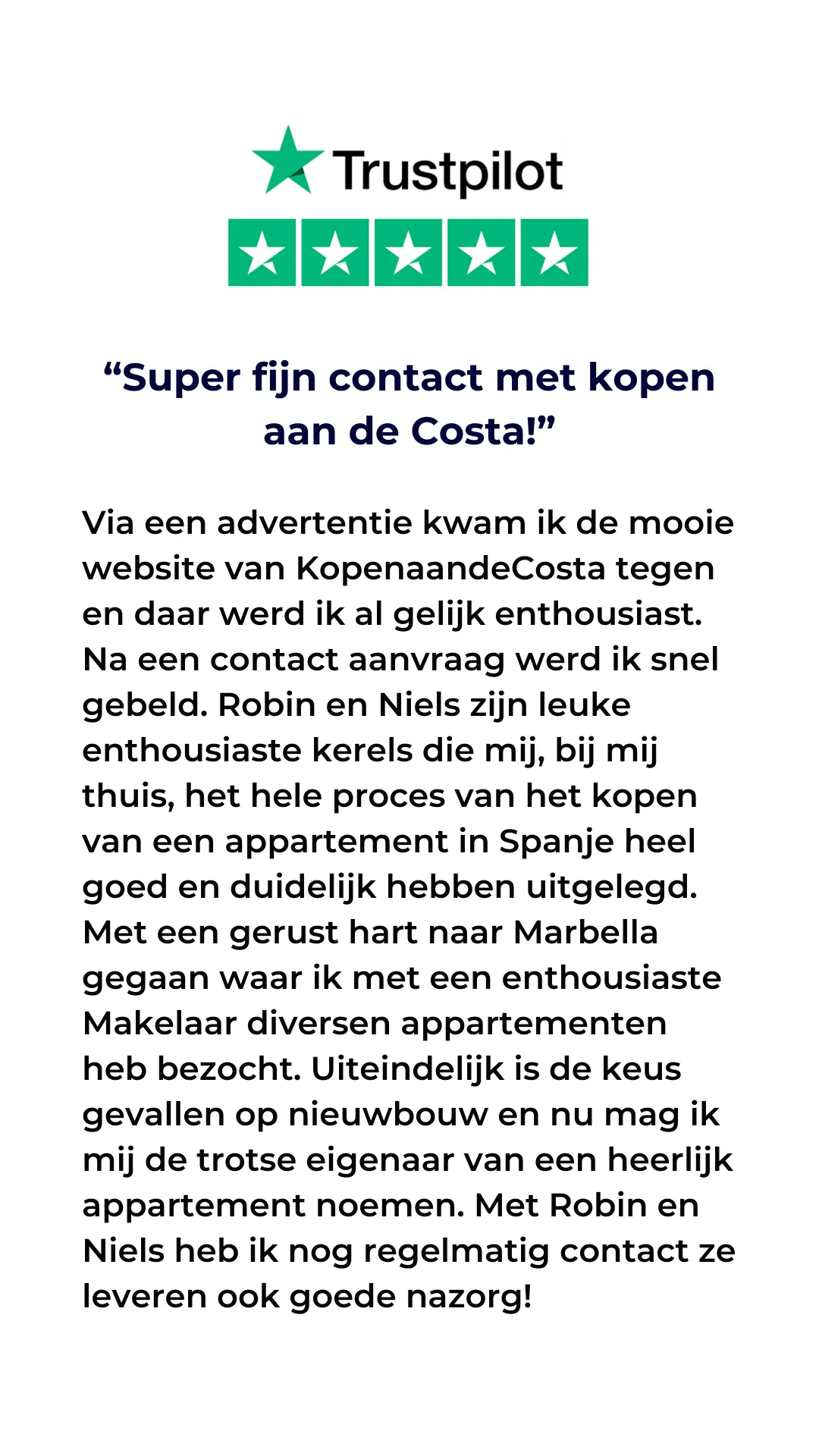 Met onze Kopen aan de Costa zoekservice maken we dit proces simpel en transparant. Dankzij onze gerichte aanpak en kennis van de Spaanse vastgoedmarkt kunt u vol vertrouwen uitkijken naar uw nieuwe thuis onder de Spaanse zon. Wij zorgen ervoor dat elke stap helder en doelgericht is. Onze belofte? Een vlotte, transparante ervaring zonder verrassingen.